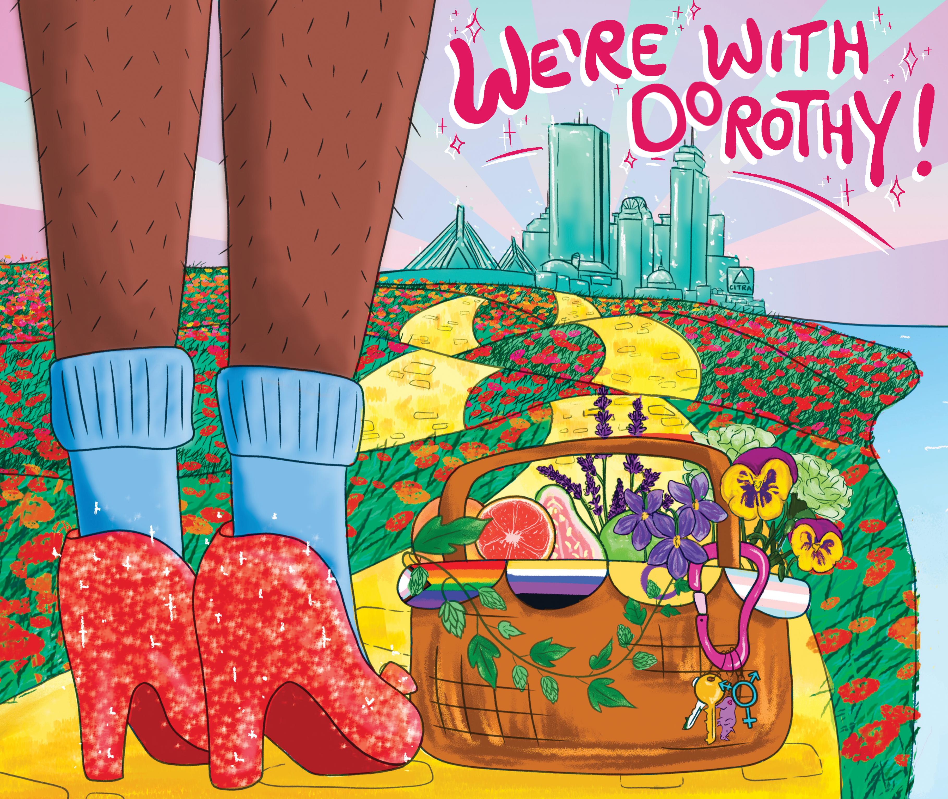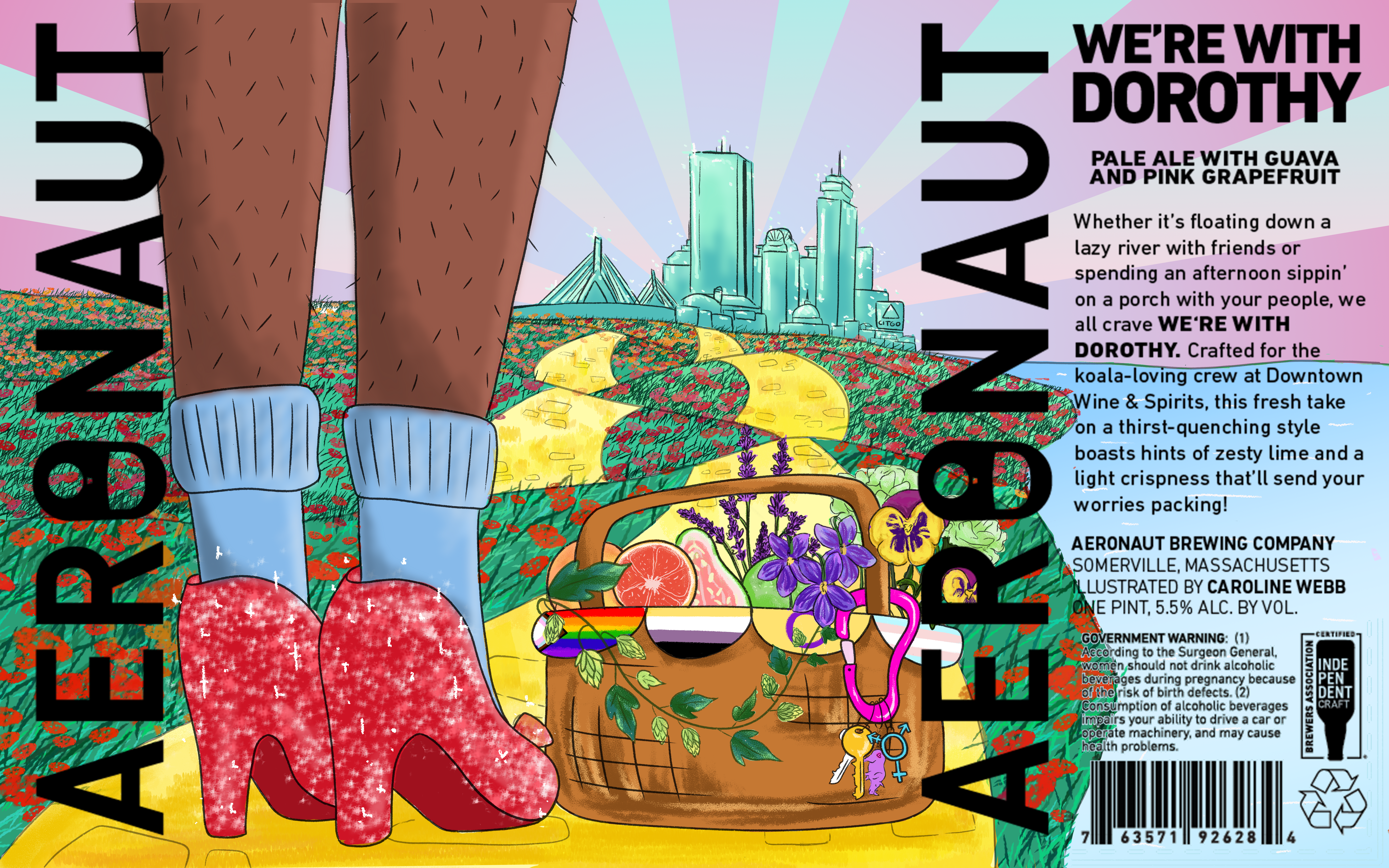 The Brief: The design concept of “We’re With Dorothy” was a collaborative effort with Aeronaut’s queer staff. The team voted on the name and design elements that were then illustrated by me. The design was a tribute to the historic code phrase “Friends of Dorothy,” while also including callbacks to the movie, the city of Boston, and classic queer imagery/symbology seen in Dorothy’s basket. Illustration was created in Procreate and Adobe Photoshop, color was added in Photoshop, and final formatting was done in Photoshop and Adobe Illustrator.